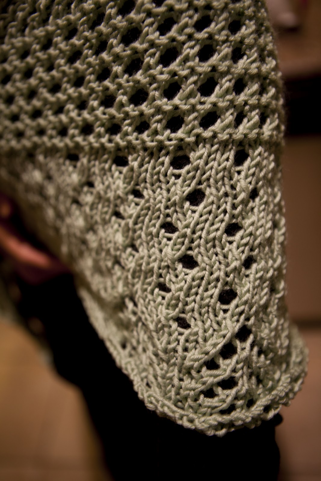 This shawl is great. It stays nice and put on the shoulders, even as I'm typing. It's warm, too, and I'm sure I'll wear this frequently. It looks better next to a tea cup than a sweatshirt! Here are some closeups: